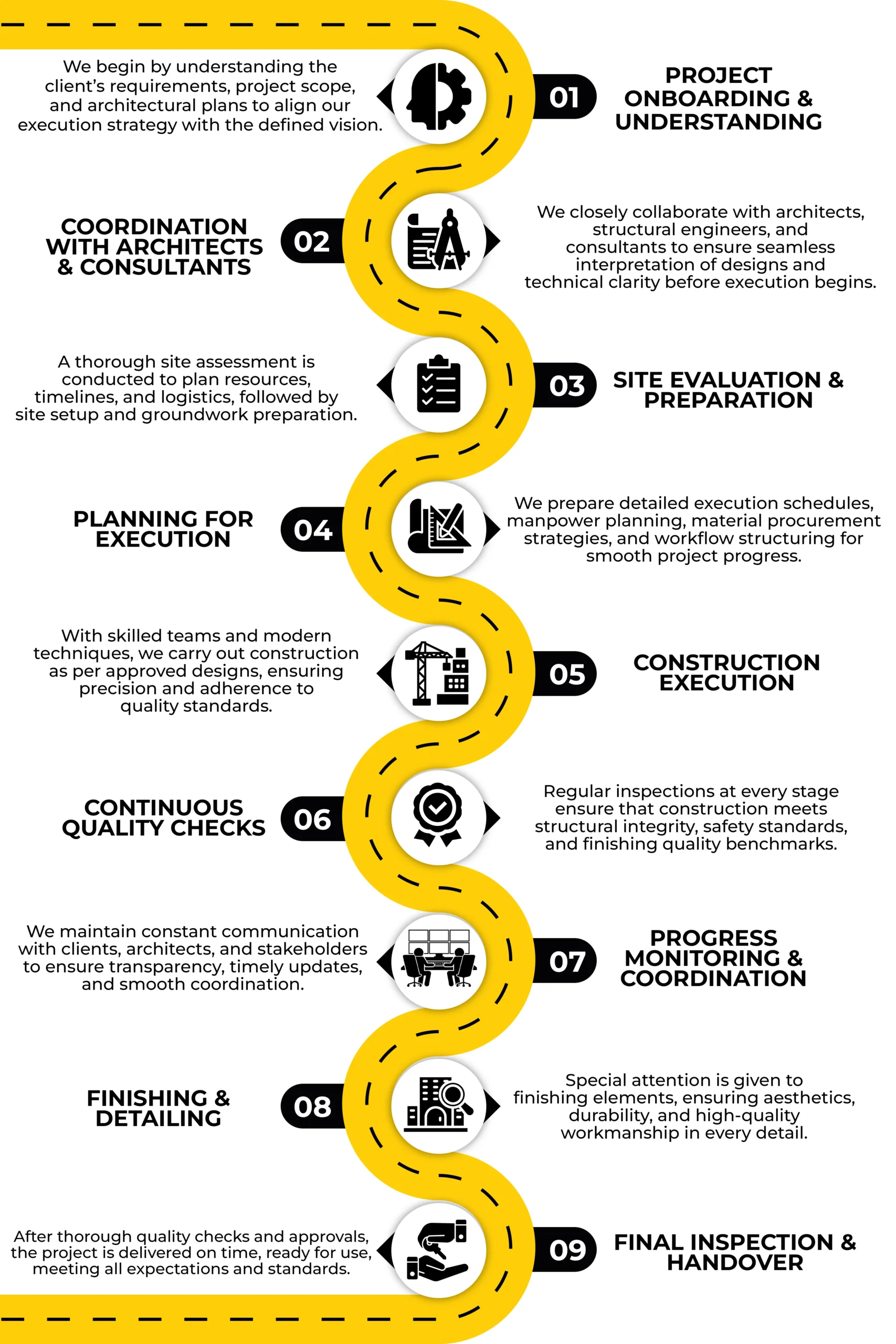 With a strong focus on structural integrity, RCC quality, and material standards, we ensure that every stage of construction—from foundation and reinforcement to finishing and handover—is executed with precision and accountability. Our use of certified materials, detailed quality checklists, and systematic execution processes ensures consistency, safety, and long-term performance to build spaces filled with trust, strength, and lasting value.
